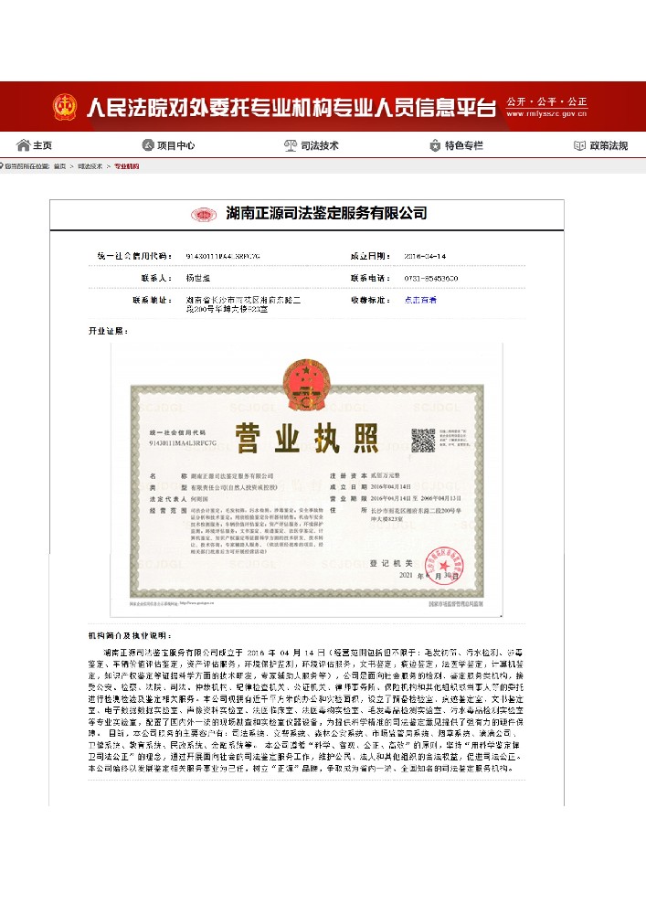 湖南正源司法鉴定服务有限公司(Hunan Zhengyuan evidence science service Co.Ltd)成立于2016年,是在全国率先经工商批准设立的专门提供司法鉴定技术顾问服务和专家辅助人服务的专业机构,经营范围包括但不限于:专家辅助人、鉴定技术咨询、知识产权鉴定、毛发污水检测、毛发初筛、亲子鉴定、机动车安全技术检测服务等;目前,我们开展的鉴定服务涉及的项目主要有:文书鉴定...